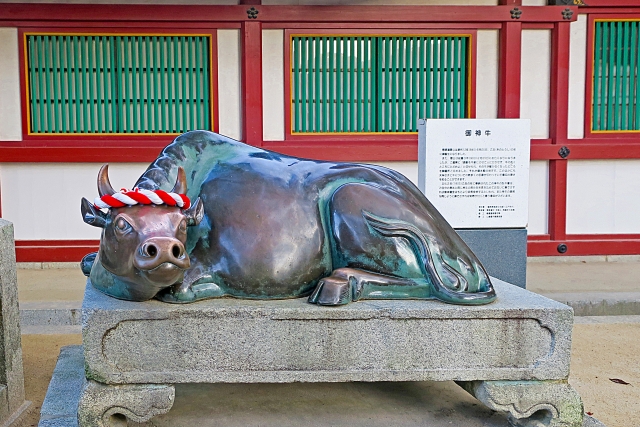 太宰府天満宮の境内を訪れた人が必ず立ち寄るスポットのひとつが「撫で牛」です。撫で牛の由来は、菅原道真公が丑年に生まれたことや、亡くなった際に牛が道真公の亡骸を運んだという伝説に基づいています。そのため境内には複数の牛の像が置かれており、古くから「撫で牛」として親しまれてきました。