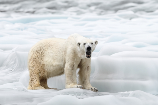 北極では氷が年々薄く小さくなり、ホッキョクグマは獲物を追うための足場を失い始めています。餌が不足することで体力を消耗し、繁殖に影響が出るケースも急増しています。
